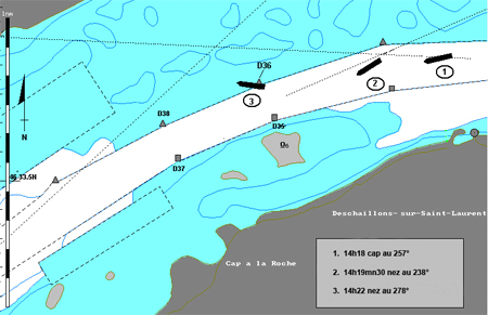 La remontée du fleuve se déroule sans incident; le navire file quelque 9,5 noeuds sur le fond avec un courant de jusant de 2 ou 3 noeuds. L'officier de quart, le timonier, le pilote et un apprenti-pilote se trouvent sur la passerelle. Les deux pompes de l'appareil à gouverner sont en marche et le timonier gouverne en mode manuel à l'aide du volant FU. Vers 14 h 18, alors que le navire se trouve près de Deschaillons-sur-Saint-Laurent, on donne l'ordre de venir à gauche, et le timonier met le cap au 257° (G) (Voir position 1, figure 1)Note de bas de page 4. Puis, pour compléter le virage, le pilote ordonne de venir au 248°, puis au 246° immédiatement. Le timonier met la barre à gauche à 15°, et l'avant du navire dévie rapidement sur bâbord, au-delà des 246° voulus, pour se stabiliser au 238° environ (Voir position 2, figure 1). Le timonier ayant déjà mis la barre à droite à quelque 19°, l'avant du navire commence à revenir sur tribord. Le timonier met d'abord la barre à gauche à 10°, puis à 20° pour arrêter l'abattée au 246,° le cap voulu. Le navire poursuit son évolution sur tribord et, vers 14 h 20, le timonier se rend compte que le gouvernail ne répond pas quand il met la barre à gauche.