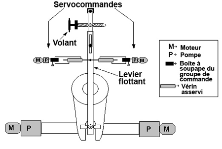 - L'utilisation d'un seul télémoteur a été rendue possible grâce à l'installation d'un commutateur-sélecteur sur la passerelle, assurant le découplage de chaque servocommande par rapport aux pompes principales de l'appareil à gouverner.