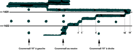 Le pilote ordonne de mettre la barre à gauche toute, mais le gouvernail ne répond toujours pas. On essaie rapidement une manette NFU, puis l'autre, mais sans résultat. Le navire vient sur tribord, et le courant au 070° (V) est sur l'avant bâbord. À peu près à ce moment-là, le capitaine arrive sur la passerelle et on le prévient que le gouvernail ne répond pas. On ordonne de faire machine arrière toute et l'on déclenche la procédure d'arrêt en catastrophe. Avant que le moteur ait le temps d'atteindre la puissance en marche arrière, le navire sort du côté nord du chenal sur un cap au 285° environ. Alors que le navire file presque 9 noeuds et que l'avant talonne dans le chenal, le navire dévie d'environ 7° sur bâbord avant de s'immobiliser rapidement à 14 h 22. Le navire s'échoue par 46°33′48″ N et 072°07′33″ W sur un cap au 278° (position 3, figure 1), la barre à gauche toute, mais le gouvernail orienté à quelque 4° à droite.