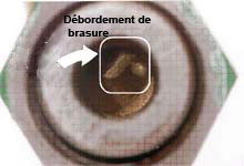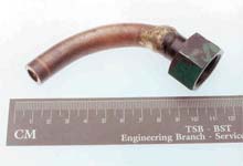 Au moment de leur installation au chantier naval, les tuyaux de raccordement des servocommandes étaient en cuivre. Les raccords de tuyauterie ont été effectués à l'aide des méthodes de brasage direct et de joints aboutés simples (photo 3). Les joints contenaient une grande quantité de brasure à l'extérieur, et le joint qui a été examiné minutieusement lors de l'enquête contenait un débordement de brasure dans le trou d'alésage interne (photo 4). On a calculé que l'obstruction devait limiter l'écoulement à quelque 70 % du débit de conception. Note de bas de page 8 Les pliures de la tuyauterie étaient non symétriques et aplaties à certains endroits, au point que, au cours des réparations effectuées après l'échouement, la Sécurité maritime de Transports Canada a exigé que toute la tuyauterie des servocommandes soit remplacée par des tuyaux d'acier pliés, ajustés et calibrés correctement.