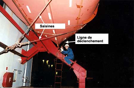 Les bossoirs tribord avaient fait l'objet d'essais et avaient reçu l'approbation de sécurité, et ils avaient été préparés au port en prévision du voyage, l'embarcation de sauvetage sous bossoir étant à poste en position verrouillée. Toutefois, quand le navire a appareillé de Montréal, les bossoirs bâbord étaient en position déverrouillée, l'embarcation de sauvetage n'étant retenue en place que par les saisines et le frein du treuil.