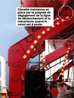 Quand une embarcation de sauvetage sous bossoir est à poste, les poignées de dégagement des lignes de déclenchement sont alignées avec les berceaux du bossoir (voir la photo 2). En position verrouillée, les clavettes sont fixées en travers du chemin de roulement, de façon à empêcher la descente de l'embarcation de sauvetage. En positiondéverrouillée, les poignées de dégagement des lignes de déclenchement sont ramenées vers le bas, à la verticale, ce qui libère la ligne de déclenchement et pousse de côté la clavette, pour permettre aux bossoirs et à l'embarcation de sauvetage de descendre sur le chemin de roulement (voir la photo en médaillon dans la photo 2).