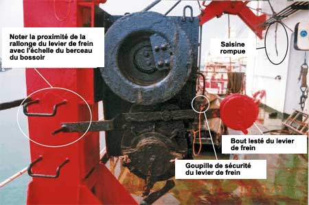 - Les barreaux de l'échelle du berceau de bossoir étaient situés à proximité du levier du frein du treuil défectueux; quand le matelot est descendu du berceau de bossoir arrière, il a probablement posé le pied sur la rallonge du levier de frein du treuil plutôt que sur le barreau de l'échelle, libérant ainsi l'embarcation de sauvetage.
