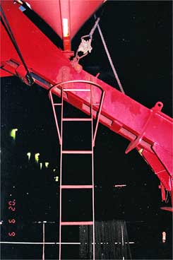 - On a installé des échelles verticales permanentes en-dessous et à côté du point de fixation des lignes de déclenchement, de façon que le personnel puisse accéder directement au mécanisme de fixation des lignes tout en étant protégé (voir la photo 6). On a retiré les échelles existantes qui menaient au bras du berceau.
