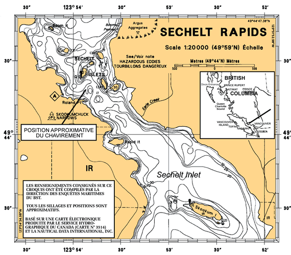 Le Deep Water quitte Egmont à environ 10 h, heure normale du PacifiqueNote de bas de page 2, et prend la direction du nord vers le chenal Agamemnon. Après presque une heure de pêche médiocre, l'embarcation descend vers le sud, traversant les rapides Sechelt jusqu'au bras Sechelt. Le groupe y pêche jusqu'à environ 12 h 45 puis tente de retourner vers le nord par les rapides Sechelt. Contrairement aux conditions de la première traversée, il y a maintenant un fort courant de jusant vers le nord. Le Deep Water est saisi par un vif contre-courantNote de bas de page 3, qui retourne l'embarcation sur 180 degrés et la renvoie vers le sud en direction du bras Sechelt. Avant que l'embarcation ne puisse atteindre les eaux relativement calmes du bras, il chavire dans une section des rapides entre les îlots Sechelt et la pointe Roland.