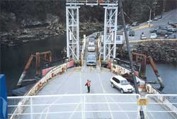 Lorsque tous les propulseurs fournissent une poussée propulsive en « marche avant » et que l'officier responsable de la timonerie (OQ) est certain que la situation s'est stabilisée, il fait signe à l'« officier responsable du débarquement » d'être paré au débarquement. L'abaissement de la rampe du débarcadère sur le pont des véhicules est télécommandé, le navire est amarré au quai et le grillage protecteur du pont est enlevé. Les passagers-piétons sont les premiers à débarquer, suivis des véhicules. Le navire embarque ensuite son chargement pour le voyage de retour.