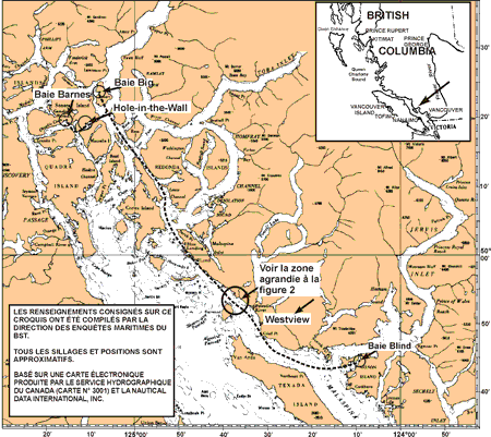 Le Bruce Brown appareille de Westview le 9 juin avec le propriétaire-exploitant et son fils pour effectuer le remorquage à destination de la baie Big. Le bateau arrive à la baie Big vers 19 h, heure avancée du Pacifique (HAP)Note de bas de page 1 le soir même. Les deux membres de l'équipage amarrent bien l'objet qu'ils remorquent et s'installent pour passer la nuit à bord du Bruce Brown. Pendant le voyage entre la baie Big et la baie Barnes où ils doivent prendre le deuxième objet à remorquer, ils empruntent le passage de 4 milles de long connu sous le nom de Hole-in-the-Wall; à cet endroit, les courants des marées peuvent atteindre 12 noeuds. L'étale de pleine mer à la sortie ouest de ce passage situé à 8 milles de là doit commencer à 4 h 30 le 10 juin; la baie Barnes se trouve 3 milles plus loin. Par mesure de sécurité, le Bruce Brown appareille de la baie Big à 5 h.