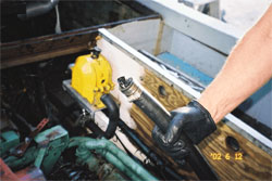 L'eau de refroidissement non traitée, dont la température s'est réchauffée sous l'effet de la chaleur du moteur, a réchauffé le ruban d'électricien et a amolli l'adhésif. Les fils de renforcement du tuyau de caoutchouc limitaient la capacité des colliers de serrage à comprimer le tuyau contre le réducteur. La pression du liquide de refroidissement, fournie par la pompe de circulation, a fini par étirer l'adhésif du ruban d'électricien; le raccord a cédé et le tuyau s'est détaché. (Voir photo 3).