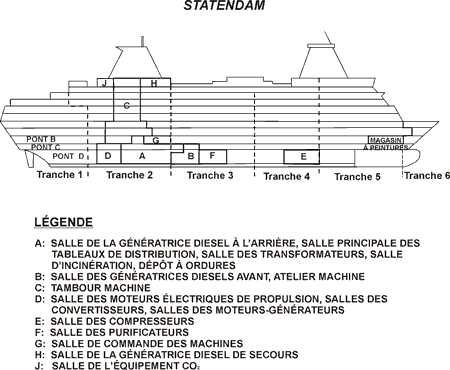 Selon la règle 26, partie B, chapitre II-2 de la Convention SOLAS, la salle de commande des machines est considérée comme un local de catégorie 1, et la SPTD ainsi que les salles des transformateurs, comme des locaux de catégorie 10. Par conséquent, le pont séparant la SPTD et la salle de commande des machines ainsi que les cloisons séparant la SPTD et les salles des transformateurs et des injecteurs de combustible ont été construits pour répondre à la norme A-0 de protection contre l'incendie.