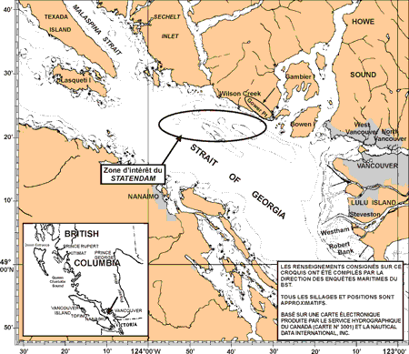 Dans la timonerie, le capitaine a déterminé que le navire ne courait pas de danger immédiat de s'échouer ni ne présentait aucun danger pour la navigation. Le Statendam se trouvait dans le détroit de Géorgie à environ quatre milles de la pointe Gower (Colombie-Britannique), qui était le point à terre le plus proche (voir la figure 2). Le capitaine a informé le centre des Services de communications et de trafic maritimes (SCTM) de la situation et de la position du navire; aucun message « Pan Pan »Note de bas de page 11 n'a toutefois été diffusé. Les annonces voulues ont été faites sans délai aux passagers et aux membres de l'équipage, les renseignant sur la situation. Il n'y a pas eu de panique.