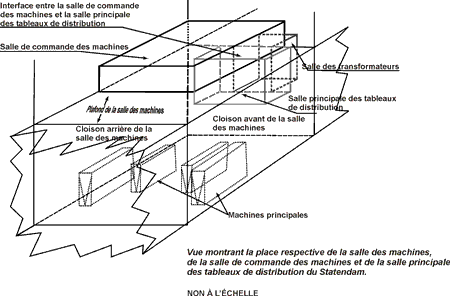 . Le débit des GED principaux passe par une salle réservée aux tableaux de distribution, située au niveau du pont C de la salle des machines (voir les figures 3 et 4 à l'annexe C). La salle principale des tableaux de distribution (SPTD) contient des tableaux de distribution de 6,6 kV et de 440 V et leurs barres omnibus ainsi que leur appareillage de commutation et de protection. Des transformateurs abaisseurs sont situés dans leur propre salle, à l'avant de la SPTD et au même niveau.