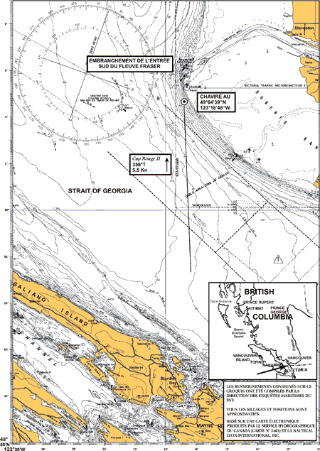Le matin du 13 août 2002, le bateau de pêche commerciale au saumon Cap Rouge II se dirige vers l'entrée du bras principal du fleuve Fraser (Colombie-Britannique). Alors que le bateau se trouve à environ deux milles au sud du phare de Sand Heads, il chavire avec sept personnes à son bord. Deux personnes s'échappent du bateau et montent à bord du youyou de senne pris en remorque par le bateau de pêche. Cinq personnes, dont deux enfants, demeurent prisonnières de la coque renversée et se noyent.