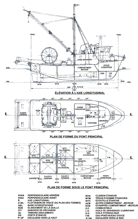 Le poisson est contenu dans trois des quatre cales isolées (voir la figure 1). Chaque cale est conçue pour contenir un mélange d'eau de mer et de glace dans lequel le poisson est transporté jusqu'à l'usine de transformation. Tout le poisson, sauf environ 200 livres, est distribué également entre les deux cales avant. Les autres 200 livres sont contenues dans la cale bâbord arrière; il n'y en a pas dans la cale tribord arrière. Chacune des quatre cales est partiellement remplie d'eau de mer. Les deux cales avant sont pleines environ aux deux tiers ou aux trois quarts; les cales arrière sont environ au huitième de leur capacité.