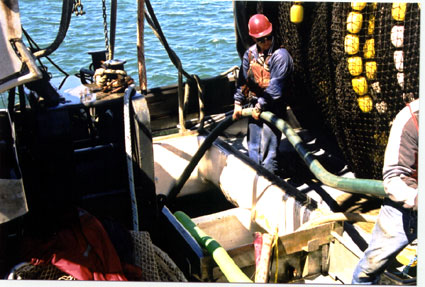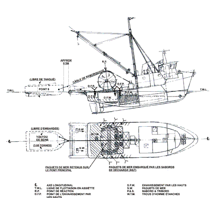 En préparation du voyage, un cordage a été attaché à un guide fixé directement aux étraves bâbord et tribord du youyou de senne à moteur puis passant au-dessus du rouleau arrière de la rampe de chargement du poisson et vers l'avant jusqu'au sommet de la senne enroulée sur le tambour et fixé au treuil de la senne coulissante situé à l'avant de l'écoutille des cales de poisson. Le cordage est initialement tendu. À ce moment, la proue du youyou de senne est serrée contre le rouleau de la rampe arrière du Cap Rouge II. (Par la suite, la proue du youyou de senne se désolidarise du rouleau à mesure que le cordage s'étire pendant que le bateau avance.) Ce travail est effectué pendant que le Cap Rouge II est stationnaire, avant le début de son voyage vers l'usine de transformation.