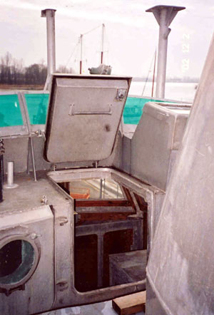 Une superstructure en aluminium renfermait la timonerie, la cabine du capitaine, la cuisine, le mess de l'équipage, les toilettes, l'accès à la salle des machines et une trappe d'évacuation. Une porte contre les intempéries, montée sur pentures et donnant sur le pont gaillard, était placée sur le côté tribord de la timonerie. Un panneau d'écoutille-porte à charnières sur la médiane à l'arrière de la timonerie offrait une sortie de secours et donnait accès au poste de gouverne extérieur, au-dessus du rouf principal (voir la photo 8). Une porte étanche à charnières permettant de passer de la cuisine au poste arrière du pont principal était située à tribord de la médiane de la cloison arrière du rouf.