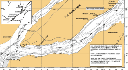 On ne fait pas référence au « mouillage Saint-Jean » dans les Instructions nautiques. Localisé au sud-est de Pointe-Saint-Jean, île d'Orléans, il offre un mouillage par fond de vase d'une profondeur de 10 à 24 m. Situé à l'intersection amont du Chenal du Sud et de la Traverse du Nord, il est délimité au nord par la bouée K135 et au sud par la bouée K131. La limite ouest correspond approximativement à la limite est du port de Québec. Au nord-est, on trouve la bouée cardinale sud « DAME », indiquant le début du récif de l'île Madame. La limite nord-ouest du mouillage se trouve à proximité de l'alignement de Saint-Michel qui est orienté au 033°−213°(voir la figure 2).