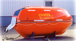 Pour mettre l'Ovatek 7 à l'eau, on fait pivoter le radeau sur son berceau et on le pousse par-dessus bord, l'avant en premier. Le berceau comporte un cran transversal qui fait place à la quille du radeau et facilite la mise à l'eau. Dans le cas de l'Ovatek 4 au fond plat, il faut deux personnes pour d'abord le soulever de son berceau, puis le lancer par-dessus bord pour éviter d'endommager les poches à eau qui pendent en dessous.Les deux modèles d'Ovatek ont été approuvés par Transports Canada en juin 1998 en tant que radeaux de sauvetage pour les navires qui sont soumis au Règlement sur l'inspection des petits bateaux de pêche, au Règlement sur l'inspection des grands bateaux de pêche ainsi qu'au Règlement sur l'équipement de sauvetage.