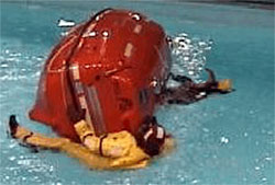Righting Test (Inflatable Liferafts) – Before attempting this test, an inflated liferaft is loaded with its heaviest equipment pack and inverted in the water. All entrances, ports, and other openings in the liferaft canopy must be opened to allow the infiltration of water into the canopy when capsized. The canopy is to be allowed to fill completely with water, if necessary by partially collapsing the canopy support. Righting arrangements are considered satisfactory if each person rights the liferaft unaided.