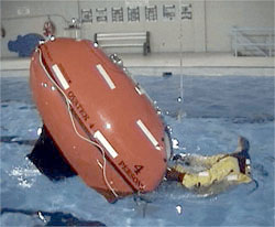 Stability Test – To test the stability of a liferaft, two people, each wearing an immersion suit, must first board the empty liferaft and then demonstrate that they can readily assist from the water a third person, also wearing an immersion suit, who is required to feign unconsciousness. The third person must have his or her back towards the liferaft so that he or she cannot assist the rescuers. In this test, it must be ascertained that the water pockets of the liferaft adequately counteract the upsetting movement on the liferaft, and that there is no danger of the liferaft capsizing.