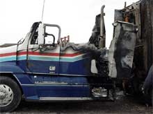 - Un camion-tracteur a été complètement détruit. Sa remorque a été fortement endommagée et sa cargaison de jus d'orange a été perdue.