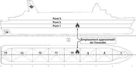 Le voyage se poursuit sans incident jusqu'à 23 h 10 lorsque deux alarmes de détecteurs de chaleur se déclenchent sur la passerelle alors que le navire se trouve par 47°26,5′ de latitude nord et 59°08′ de longitude ouest, à environ huit milles marins de Port aux Basques. Presque simultanément, la personne de quart au pont-garage, qui fait sa ronde sur le pont-garage 1, découvre un incendie à proximité d'un camion à semi-remorque (figure 1). La personne de quart au pont-garage quitte le pont par la première porte avant à bâbord et se rend immédiatement à un dispositif d'alarme manuel situé de l'autre côté de la porte. Elle actionne le dispositif, mais, n'entendant aucune alarme, elle monte au pont 3 et actionne un deuxième dispositif. N'entendant toujours pas d'alarme, elle court vers l'arrière au poste où les personnes de quart au pont-garage assurent une veille sur le pont 3, communique avec la passerelle par téléphone et signale l'incendie.