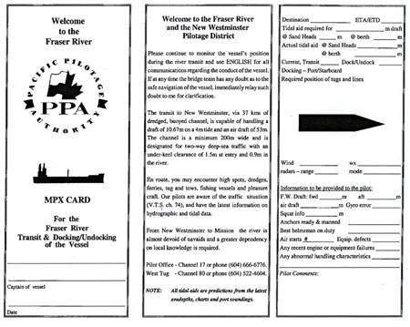 La pratique veut que le pilote du fleuve remette au capitaine une fiche de renseignements capitaine/pilote sur laquelle sont indiquées la largeur du chenal, l'information sur les marées et les courants pour la traversée ainsi que les points d'arrimage des remorqueurs. (Voir l'Annexe A). Une fiche de renseignements avec ces informations n'a pas été remise au capitaine du Cielo del Canada; cependant, selon l'information recueillie, le pilote du fleuve a discuté avec le capitaine de certains des éléments figurant sur la fiche.