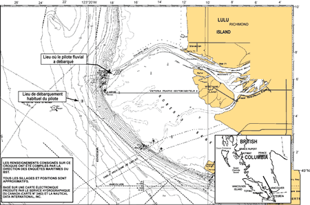La position prévue sur les cartes pour le changement de pilotes est située à environ 1,8 mille au sud-ouest du phare de Sand Heads, mais il s'agit d'un lieu où l'on rencontre souvent du trafic et qui est exposé aux effets du mauvais temps. Il était donc devenu habituel en présence d'un trafic important ou de mauvais temps que le changement de pilotes se fasse sur le fleuve, près de l'embouchure du fleuve. Il semble toutefois que cette pratique était devenue la norme, les pilotes du fleuve confiant prématurément la conduite du navire aux pilotes côtiers même lorsque les conditions ne l'exigeaient pas.