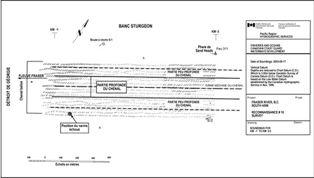 Le navire s'est échoué à l'intérieur du chenal balisé, entre les bouées S2 et S0 (comme le montre la carte no 3490 du SHC à la Figure 1), où une barre qui se prolongeait dans le chenal dragué était signalée depuis trois ans. Les sondages du fleuve du 17 septembre 2003, auxquels le pilote du fleuve avait accès, indiquaient une profondeur de 6,3 m au-dessus du zéro des cartes à l'endroit où le navire s'est échoué. La tolérance de marée à ce moment était de 3,5 m, pour une profondeur d'eau disponible de 9,8 m. Cette profondeur reste toutefois inférieure aux 10,25 m du tirant d'eau maximal du Cielo del Canada.