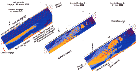 Lorsque le fleuve ralentit après le ruissellement maximal, il est difficile de faire un suivi de l'état et de l'évolution des sédiments déposés dans les diverses parties du fleuve. Le lit du fleuve change constamment et rapidement, des parties préoccupantes du chenal navigable pouvant s'ensabler en 48 heures.