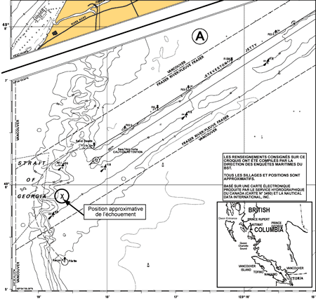 - Pendant que le capitaine et l'officier de quart sont ainsi occupés et que le navire poursuit sa route à vitesse réduite, le navire amorce une abattée sur bâbord. Pour enrayer l'abattée, le pilote ordonne de mettre la barre à droite et de mettre la machine à en avant lente. Cependant, à 8 h 28, le navire s'échoue sur un fond mou dans le chenal balisé, entre les bouées S2 et S0, à la position 49°05′55″N, 123°18′39″W. À la demande du pilote côtier, le pilote fluvial remonte à bord pour aider à la remise à flot du navire.