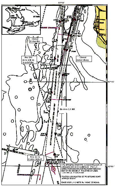 l'approche du feu de la rivière Détroit, l'ensemble file à une vitesse d'environ 10 nœuds. Le navire participe au système de la zone locale de couverture des services du trafic maritime (STM).