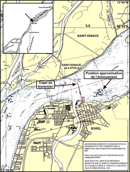 Quand le personnel navigant surveille les radars, tous deux réglés sur l'échelle de 1,5 mille marin, les échos de la rive se déplacent rapidement, formant une image brouillée qui empêche le personnel navigant de déterminer la position du navire. Sans indices visuels et incapables d'interpréter l'information radar en raison de l'image brouillée produite par l'embardée, le capitaine et l'officier de pont utilisent l'affichage du GPS, qui change continuellement, pour avoir une idée de la vitesse du navire. Pendant qu'on essaie d'arrêter le navire en se guidant par cet instrument de navigation, la vigie signale la présence de bouées à l'avant. Le capitaine manoeuvre pour éviter les bouées et, peu après, vers 5 h 45, le navire s'échoue par 46°03′08″;N, 073°06′09″W, sur un cap gyroscopique de 168° (voir la figure 1 et l'annexe A).