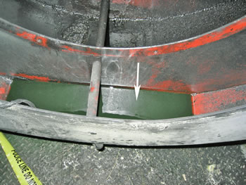 Dans le cas qui nous occupe, la force des explosions a été supérieure à ce que pouvait supporter la porte du brûleur de la chaudière; les quatre tourniquets de serrage ont été arrachés et la porte s'est entrouverte. Les tubes du brûleur principal et de veilleuse ainsi que le registre d'air tertiaire ont été délogés, et la tringlerie du régulateur de débit d'air du brûleur s'est rompue. L'explosion a été suffisamment puissante pour déplacer les briques réfractaires dans le fond de la chaudière (Photo 5).