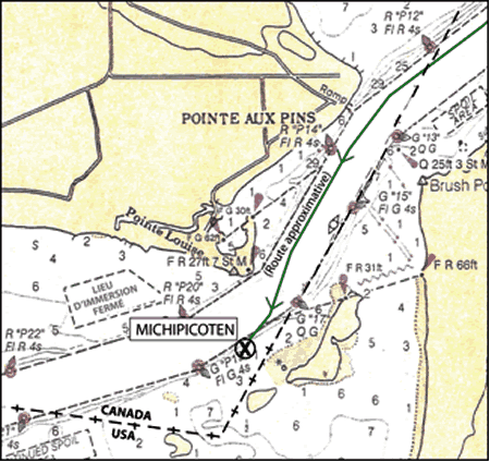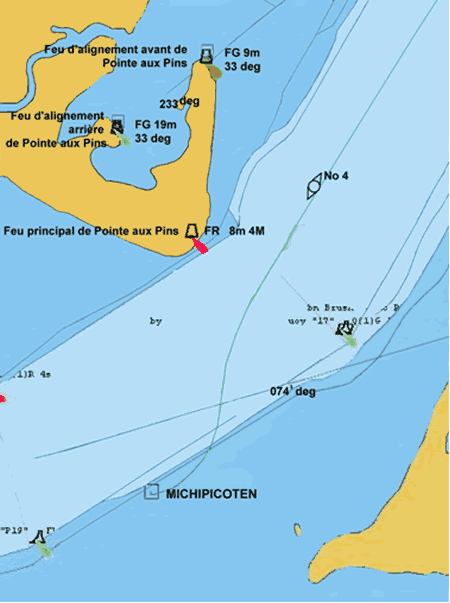 Près de la ligne entre la bouée G13 de Brush Point et Pointe aux Pins, le Michipicoten vire sur bâbord, en direction de Pointe Louise, pour suivre la route recommandée pour le chenal principal au 210º Vrai (V). Le changement de cap suivant au 238º V) (changement de cap sur tribord) serait à partir de la ligne entre la bouée G17 de Brush Point et Pointe Louise. Vers 7 h 23, alors que le navire s'approche du point de changement de cap suivant, le brouillard masque la limite est du chenal sur le côté bâbord du navire et le capitaine ne peut apercevoir les prochaines balises d'alignement à l'avant. Alors qu'il tente de détecter les bouées qui sont mouillées sur la limite est du chenal, il communique avec Soo Traffic Control.