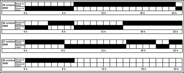 Les résultats des calculs effectués pour déterminer l'horaire de travail et de repos d'une personne par période de 24 heures et de 48 heures dépendent des heures choisies pour le début et la fin de la période observée. Dans le cas présent, les calculs couvrent la période débutant à 7 h 30 le 25 octobre 2005 et se terminant à 7 h 30 le 28 octobre 2005.