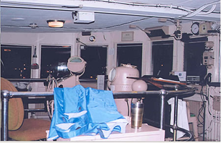 Le capitaine assure la conduite du navire, essentiellement à partir du siège du pilote qui est situé à l'avant tribord du centre. À partir de cet emplacement, il doit se pencher en arrière et regarder par-dessus son épaule droite pour voir l'ECS. L'intensité lumineuse de l'écran ECS a été réglée à l'affichage de nuit monochrome, ce qui signifie que l'écran au complet est rouge. L'écran a également été recouvert d'un transparent rouge pour diminuer davantage la brillance de l'écran, de sorte que l'information affichée n'est pas très claire, y compris l'icône de la position du navire.