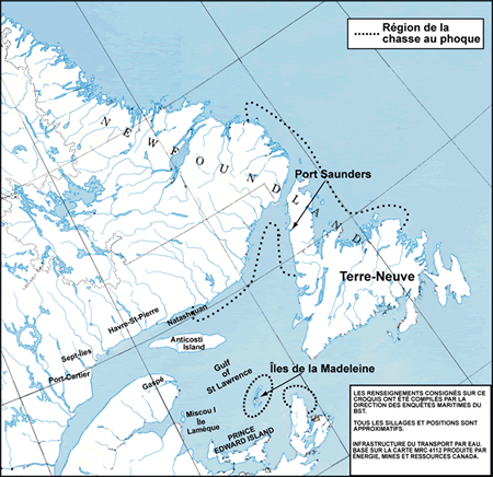 Dans le Golfe, deux troupeaux de phoques ont des petits en mars : un au sud des îles de la Madeleine et un autre, plus important, plus loin au nord près du détroit de Belle-Isle. Dans l'espoir d'atténuer la concurrence entre les régions, le MPO a statué que les chasseurs de la partie sud du Golfe (îles de la Madeleine, Nouveau-Brunswick et Nouvelle-Écosse) chasseraient le troupeau du sud; le troupeau du nord du Golfe serait réservé aux chasseurs provenant de la côte ouest de Terre-Neuve et de la Basse-Côte-Nord du Québec.