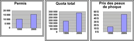 Dans les années 1960 et 1970, le prix d'une peau de phoque a varié, mais elle a baissé à son plus bas niveau dans les années 1980, soit environ 15 $ la peau. Les prix sont restés faibles jusqu'au milieu des années 1990, le quota de phoques était fixé à 186 000. Depuis, l'industrie s'est développée et en 2005 le quota a été porté à 325 000, les peaux se vendant entre 50 $ et 70 $ l'unité. L'annexe C indique la croissance de l'industrie aux plans des quotas, du prix des peaux et du nombre de permis délivrés entre 1995 et 2005.