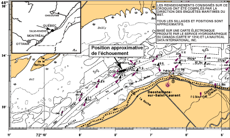 Pendant ce temps, l'officier de quart téléphone au capitaine pour l'informer de la situation. Le capitaine se rend immédiatement sur la passerelle. Le navire continue son embardée sur tribord, quitte le chenal et, à 1 h 17, s'échoue sur le côté nord du chenal près de la bouée D38 par 46°33′4″ N et 072°07′56″ W (voir la Figure 1). Le chef mécanicien et le troisième mécanicien se précipitent à la salle des machines pour aider à rétablir l'alimentation électrique et la puissance à l'appareil de propulsion à vapeur. La barre finit par répondre, mais pas assez tôt pour empêcher l'échouement.