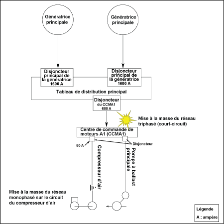 Les deux CCM, appelés CCM A1 et CCM A2, alimentent les appareils de la salle des machines et sont reliés aux barres omnibus principales par d'autres barres omnibus. Les autres panneaux, qui ne font pas partie du tableau de distribution principal, mais qui se trouvent ailleurs sur le navire, servent pour la ventilation, le propulseur d'étrave et l'appareil à gouverner, les treuils, les transformateurs, et les apparaux de pont; ces panneaux sont interconnectés aux barres omnibus principales par des câbles électriques.