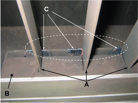 Le navire a une cale unique étanche qui est subdivisée en six cales par des cloisons non étanches. Chaque cloison est munie d'ouverture d'assèchement à la hauteur du plafond de ballast, des deux côtés de la cloison (voir la Photo 4). Chaque cale est munie d'un écoutillon pour y permettre l'accès et/ou l'inspection à partir du pont principal.