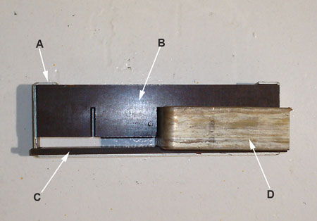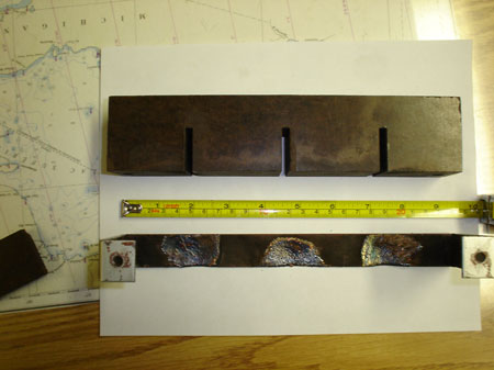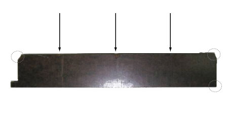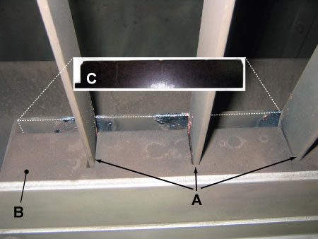 La pièce isolante plate en bakélite de 6 mm montée à la verticale a été trouvée sur le pont à l'intérieur du tableau de distribution et recouverte d'une couche de poussière plutôt uniforme, ce qui indique qu'elle était tombée depuis quelque temps auparavant. De plus, trois languettes sur quatre étaient absentes. Des marques d'enfoncement étaient visibles au droit des trois barres omnibus, ce qui indique que les barres avaient tendance à repousser l'isolant en bakélite contre le support en acier (voir la Photo 9).