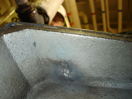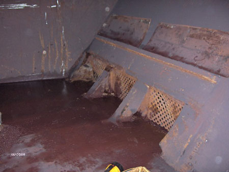 L'installation d'assèchement de cale du navire comprend deux puisards à la partie arrière de la cale unique étanche. Les puisards sont situés des côtés bâbord et tribord de la cale, adjacents à la cloison arrière à la limite arrière de la cale no 6. Les puisards sont situés à la hauteur du plafond de ballast, dans la trémie, sur le côté de la cale et se prolongent de la cloison arrière à 4 m vers l'avant. L'installation d'assèchement de cale est relié au circuit de ballastage par un tuyau de 455 mm. Chaque puisard comprend trois tôles filtres de 550 mm x 450 mm avec des perforations de 25 mm (voir la Photo 5).