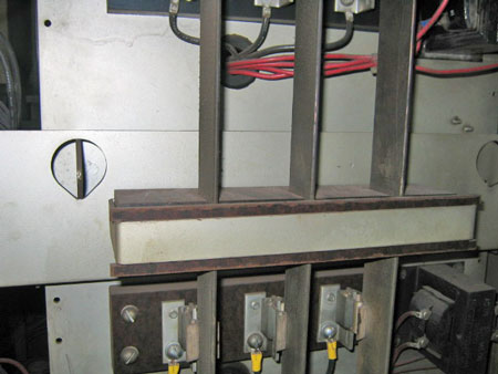 Trois barres omnibus qui alimentent la pompe de ballastage no 1 sont fixées au bâti du tableau de distribution par un support en acier. Pour isoler les barres omnibus, deux types de pièces isolantes en bakélite sont utilisés. L'une de ces pièces isolantes, qui est posée à l'horizontale, comporte trois encoches pour séparer les barres omnibus. L'autre pièce isolante (en forme de H) est une pièce plate de 6 mm. Cette pièce est logée à la verticale entre les extrémités des barres omnibus et le support en acier, ce qui empêche les barres de coulisser hors des encoches et d'entrer en contact avec le support en acier (voir la Photo 7 et la Photo 8).