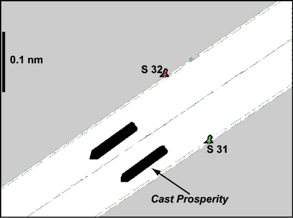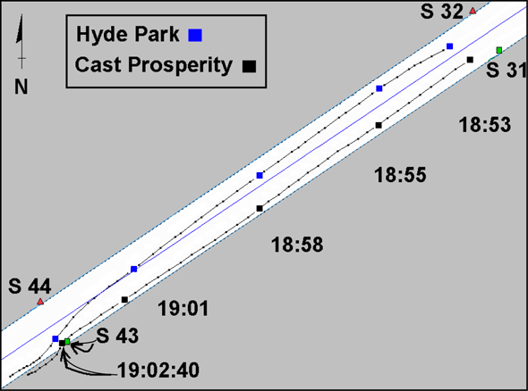 Dix minutes plus tard, à 18 h 51, le timonier du Cast Prosperity estime nécessaire de tourner considérablement la barre à gauche (jusqu'à 23 °) pour maintenir le cap souhaité au 235 ° gyro (G). Cependant, cette information n'est pas transmise au pilote, et le pilote ne détecte pas cette information sur l'indicateur d'angle de barre. Environ une minute plus tard, les navires commencent à se mettre en parallèle; la distance qui les sépare est d'environ 75 m. À 18 h 53, ils ont dépassé les bouées S-31 et S-32; le Hyde Park a réduit sa vitesse et file 7,3 noeuds, tandis que le Cast Prosperity fait route à 10,7 noeuds (voir Figure 1).