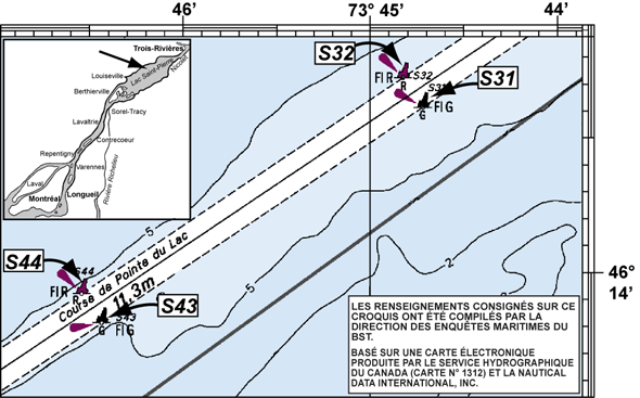 À 17 h 30 HAE,Note de bas de page 2 un pilote monte à bord du Hyde Park à Trois-Rivières (Québec) pour relever le pilote précédent. L'équipe à la passerelle à ce moment est composée du pilote, du capitaine, d'un officier de quart (OQ) et d'un timonier. Le transmetteur d'ordres est mis sur l'allure de manoeuvre en avant toute, et le navire atteint rapidement la vitesse de 10 noeudsNote de bas de page 3 environ.