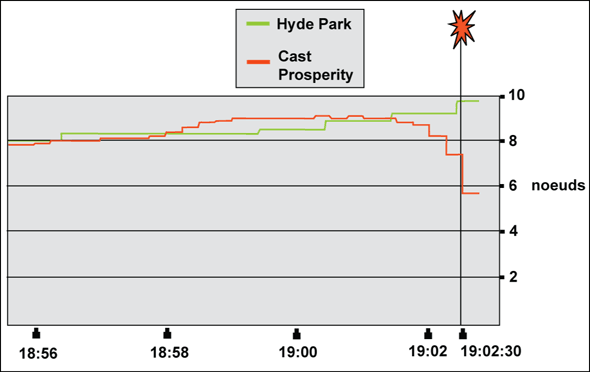 Dans les deux minutes et demie qui ont précédé l'abordage, le Cast Prosperity a été incapable d'atteindre une vitesse supérieure à 9,1 noeuds - malgré un réglage de l'hélice à pas variable qui aurait dû permettre au navire d'atteindre une vitesse plus grandeNote de bas de page 15. C'est là une démonstration du phénomène classique d'interaction hydrodynamique qu'on appelle trapping pouvant survenir lors d'un rattrapage en eaux restreintesNote de bas de page 16. Entre-temps, le Hyde Park continuait d'accélérer vers l'avant, attiré vers le Cast Prosperity, même si le transmetteur d'ordres avait été mis à en avant très lente et la barre à droite toute (voir Figure 5).