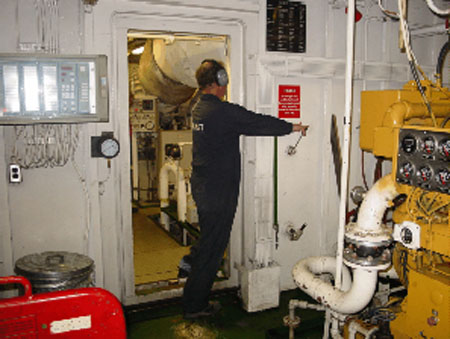 Chaque fois que le navire est en transit, les trois portes étanches sont commandées et fermées automatiquement à partir du poste de commande central de la passerelle. Il est possible d'actionner les portes à l'aide de la commande locale, mais la porte reste ouverte seulement pendant qu'on tient le levier de manoeuvre à la position ouverte. Dès qu'on relâche le levier, la porte se ferme.
