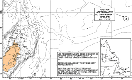 Vers 15 h 29, le bateau est engagé et continue de rouler jusqu'à se retrouver complètement à l'envers. Pendant que le bateau roulait, les huit personnes ont escaladé le côté du bateau jusqu'à ce qu'elles arrivent, debout, sur son fond. Après que le bateau a chaviré, la radiobalise de localisation des sinistres (RLS) sera aperçue à la mer, avec son feu clignotant. Les huit personnes demeureront sur le fond du bateau renversé pendant deux heures, jusqu'à ce que le bateau coule à la position approximative de 48°55,5′N, 051°17,5′W.