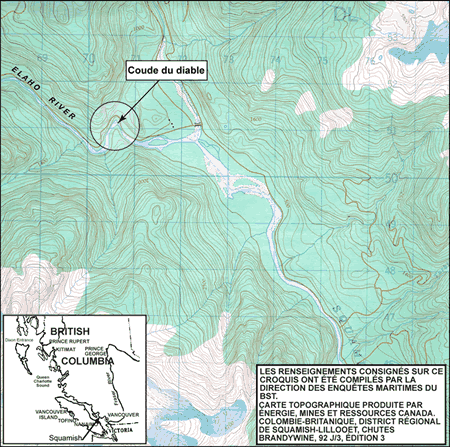 La rivière Elaho est une rivière d'envergure moyenne, alimentée par des glaciers, qui est située dans la chaîne Côtière de la Colombie-Britannique à environ 60 km au nord-ouest de Squamish (Colombie-Britannique). La turbulence de la rivière varie d'un jour à l'autre en fonction des précipitations de pluieNote de bas de page 2 et du taux d'écoulement glaciaire, lequel dépend de l'ensoleillement et de la température. Les positions des obstacles submergés (rochers, souches et rondins) varient en fonction du niveau d'eau de la rivière.